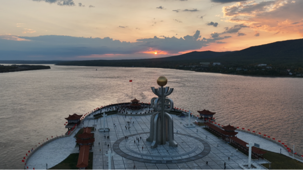 此时,乌苏里江的江面开始微微泛红,太阳缓缓跃出地平线,阳光透过云层洒在大地上,金色的光芒瞬间洒满广场,人群中响起此起彼伏的惊叹,快门声连成一片。重庆游客谢平激动地表示,看到祖国越来越强大,真的是发自内心的高兴,祝愿伟大的祖国繁荣昌盛,国泰民安!